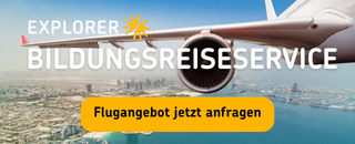 Explorer ist der Spezialist für günstige Flüge in die ganze Welt. Schüler, Studenten und junge Erwachsene profitieren ganz besonders von günstigen und flexiblen Jugend- und Studententarifen, die es in dieser Form nur bei Explorer gibt. Aber auch normale Flüge können Sie bei dem Reiseanbieter zu besonderen Konditionen buchen. Unser Kooperationspartner Explorer legt, wie wir auch, großen Wert auf eine persönliche Beratung und einen Mehrwert durch Service. Deshalb finden Sie dort keine anonyme Online-Flugsuche, sondern erhalten nach Absenden des Formulars ein individuelles, auf Ihre Bedürfnisse zugeschnittenes Flugangebot durch die Mitarbeiter des Explorer Bildungsreiseservice: